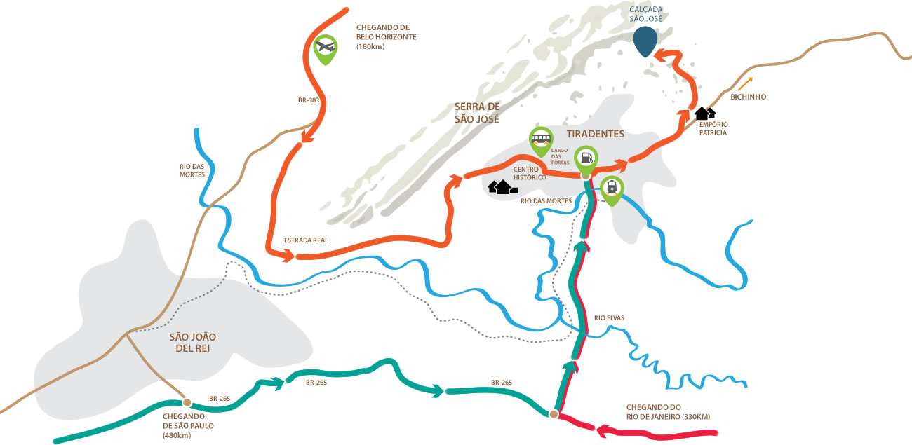 En suivant les panneaux indicatifs de la ville de Tiradentes, on prend l’ancienne Route Royale (Estrada Real) qui passe par le village de “Santa Cruz de Minas”, avant prendre le chaussé pavé de pierres qui mène au centre ville. Donc, on prend la direction de la place principale nommée “Largo das Forras”, à partir de l’aquelle on devra prendre la direction de la station-service de la ville, située près d’une petit place triangulaire, dont ond doit prendre à gauche, Il est alors nécéssaire de bien faire attention aux différents panneaux de signalisation qui indiqueront qu’il faut aller au village Bichinho et à l’auberge Calçada São José. Après avoir parcouru 1800 mètres, on trouve un bâtiment nommé Empório Patrícia Barbosa, à partir duquel on doit prendre à gauche, emprunter une voie de terre très ètroite et bucolique, ayant toujours à l’horizont le plateau nommé “Serra de São José”, et suivre les panneaux qui indiquent “Pouso Campestre Calçada São José”. Bienvenue.